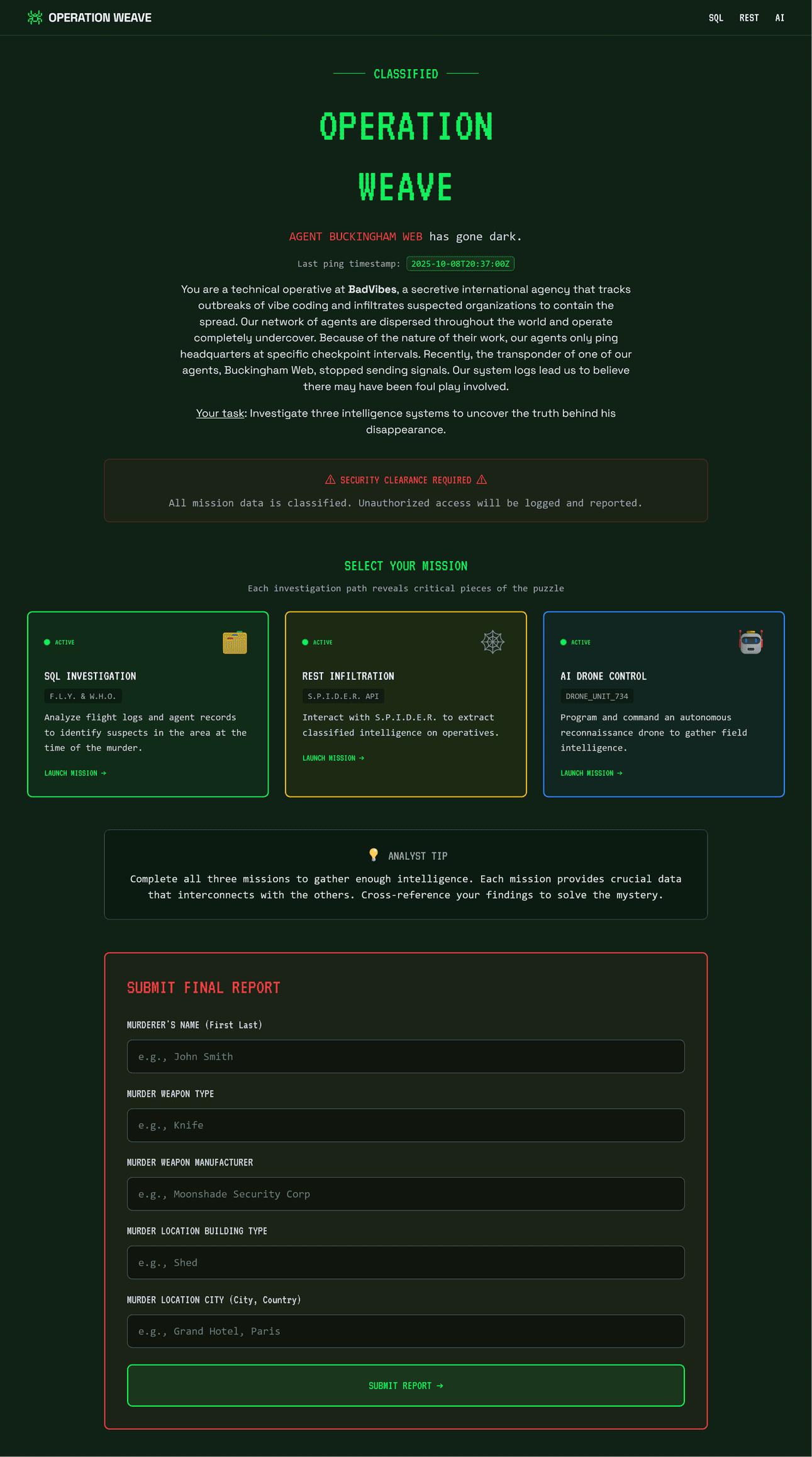 The second workshop event site for WebLabs' WebFest series, teaching participants SQL, REST APIs, and LLM tool calls through hands-on challenges.